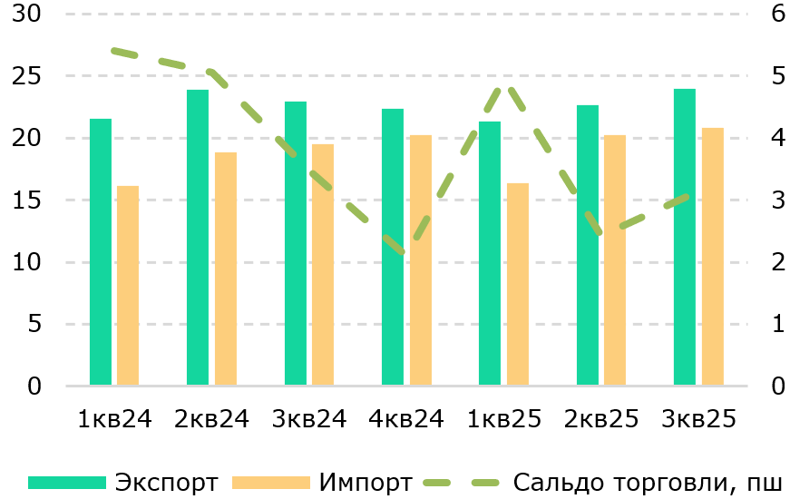 Экспорт товаров и услуг по сравнению с показателем третьего квартала 2024 года вырос на 4,4% до $24,0 млрд ($22,7 млрд во втором квартале 2025 года), чему способствовал рост объемов поставок сырья, в том числе топливно-энергетических товаров, на которые приходится более половины всего экспорта.