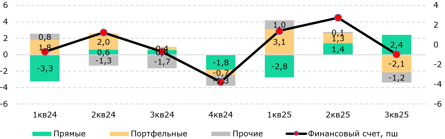 По прямым инвестициям со второго квартала продолжается чистый отток (в третьем квартале в размере $2,43 млрд), что может отражать завершение крупных проектов нефтегазового сектора и рост выплат в пользу зарубежных акционеров.