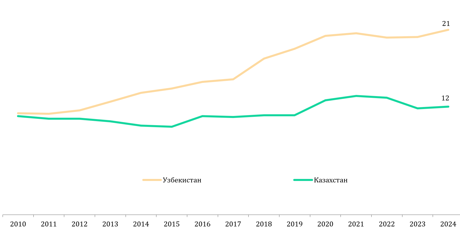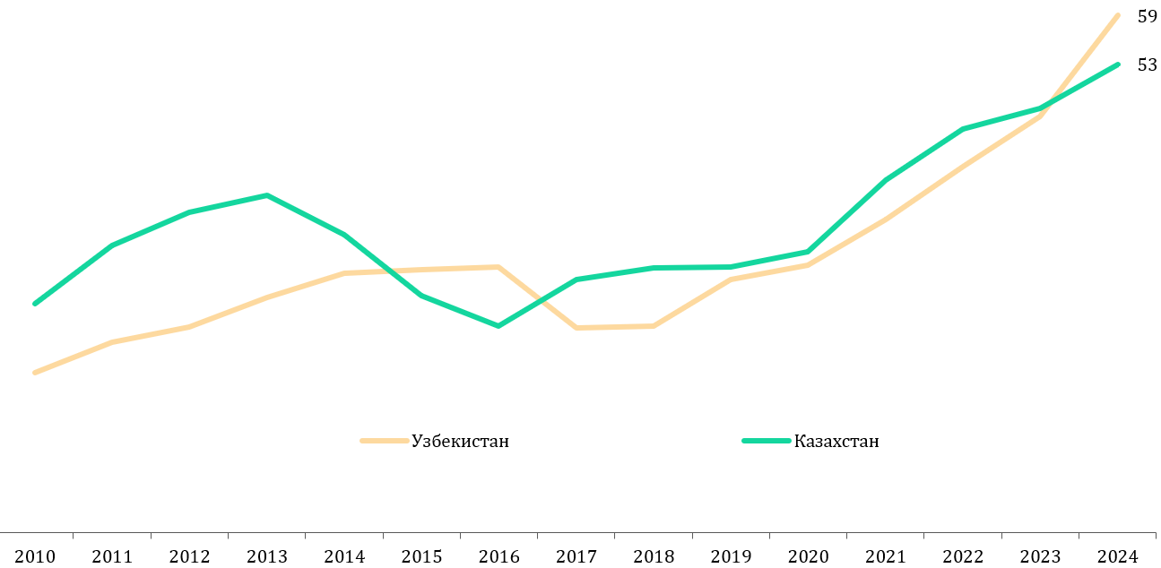 На фоне такого подъема роли обрабатывающей отрасли в соседней стране, показатели казахстанской промышленности выглядят хоть и неплохо – темпы роста отрасли обработки опережали рост ВВП, однако не были столь же впечатляющими. Доля обрабатывающей отрасли повышалась в начале 2020-х годов до 14% в структуре ВВП, но в 2024 г. несколько «откатилась» к прежнему показателю в 12% от ВВП. При этом отметим, что экономический рост в Узбекистане характеризуется стабильными темпами в пределах 6-8% в среднем в год. В Казахстане же подстройка к низким ценам на нефть существенно отразилась на темпах роста ВВП с 2015 г., хотя в последние годы экономика переживает определенное ускорение.