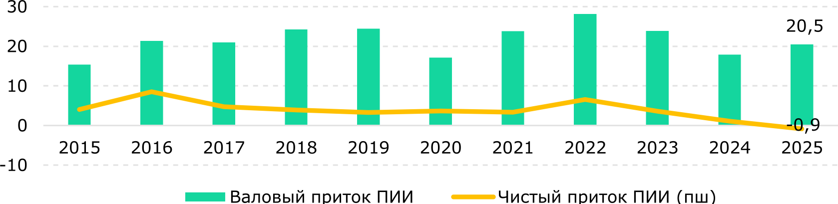 В 2025 году валовый приток ПИИ составил $20,5 млрд (+14,4% г/г), впервые показав положительную динамику с 2022 года. Чистый приток ПИИ в страну продолжает снижаться: в 2025 году впервые с 2005 года  чистый приток ПИИ оказался отрицательным – отток составил $0,9 млрд (+$1,1 млрд в 2024 году) (Рис. 1).