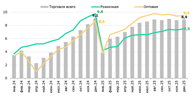 По итогам 2025 года внутренняя торговля выросла на 8,9% в годовом выражении, незначительно замедлившись по сравнению с 9,1% в 2024 году. На общем замедлении сферы торговли отразились более слабые показатели розничной торговли, которые составили 7,5% против 9,8% в 2024 году, что, по нашему мнению, связано со снижением доходов населения и замедлением роста потребительского кредитования. Оптовая торговля, наоборот, продемонстрировала улучшение динамики до 9,5% с 8,6% ранее, что, по нашему мнению, связано с ростом добычи нефти и фискальным стимулированием. На декабрьские показатели, безусловно, повлиял сезон активизации предновогодних продаж, которые выросли двузначными темпами и в оптовой, и в розничной торговле, что несколько затормозило темпы замедления в торговле. В целом замедление активности в торговле согласуется с нашими ожиданиями ввиду слабого роста доходов населения, снижения спроса на кредиты, а также усилившегося инфляционного давления. Учитывая опережающий рост торговли, ее вклад в экономический рост страны был одним из значимых факторов ускорения ВВП в прошлом году.