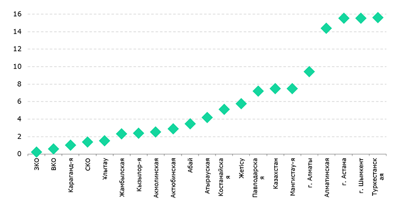 Надо отметить, что в ряде регионов фактически наблюдалась стагнация розничных продаж, так, в ЗКО прирост сложился на минимальном уровне в 0,2%, в ВКО – на 0,6%, в Карагандинской области – на 1%, также и в других регионах отмечены довольно скромные темпы продаж, что указывает на сохранение дисбалансов в развитии регионов.