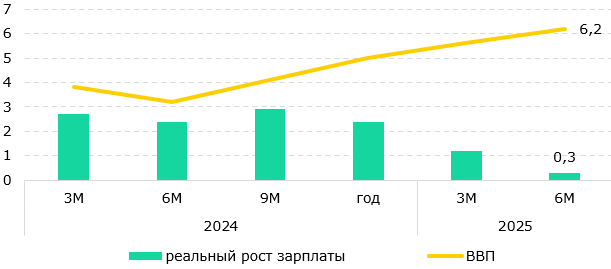 В 2024 году реальный рост доходов населения оставался положительным на уровне 3,5-4%, к 2025 году начинает расти разрыв между ростом реальных доходов населения и ростом экономики. С начала 2025 года реальный рост доходов резко снижается, достигнув отрицательных значений. Параллельно с этим наблюдаются высокие темпы роста экономики, которые должны способствовать росту реальных доходов и приводить к повышению благосостояния населения. Однако высокие темпы роста экономики в текущем году не приводят к его трансмиссии в рост благосостояния населения.