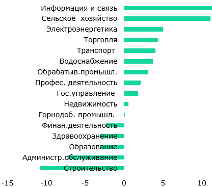 Наиболее высокие значения заработной платы отмечены в финансовом секторе (Т955 тыс.), где уровень оплаты превышает средний по стране в 2,1 раза, горнодобывающей промышленности (Т889 тыс.) – превышение в 2 раза и IT (Т820 тыс.) – превышение в 1,8 раза (Рис. 4). В то же время в трех секторах с максимальными зарплатами занято всего 6% совокупной численности наёмных работников, тогда как в здравоохранении, образовании, административном обслуживании и госуправлении, где занято более 56% наёмных работников, наблюдаются заработки ниже среднего. Более того, в данных секторах, по данным БНС, зарплаты снижаются в реальном выражении: в образовании – на 3,1% г/г, административном обслуживании – на 7,2% г/г и здравоохранении – на 3,1% г/г (Рис. 5). Высокий прирост по заработной плате в сельском хозяйстве обусловлен низкой базой прошлого периода.  В целом отраслевая неравномерность в уровне оплаты труда также связана с уровнем производительности, которая заметно различается в разрезе отраслей (см. более раннюю публикацию по производительности труда).