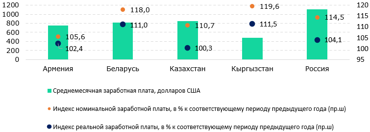 Рис. 6. Среднемесячная заработная плата и индексы заработной платы в государствах-членах ЕАЭС в январе – июне 2025 года