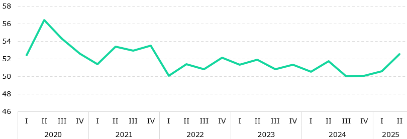 В структуре расходов населения доминируют продовольственные товары. Доля затрат домохозяйств на продукты питания выросла с 51,7% во 2 квартале 2024 года до 52,5% во 2 квартале 2025 года. На непродовольственные товары пришлось 20,3% всех затрат, на платные услуги – 18,5%, на погашение кредитов и долгов – 6,5%. Необходимо отметить долгосрочную динамику расходов на продовольствие. С 2020 года продовольственные товары в структуре денежных расходов занимают не менее 50% (Рис. 7).