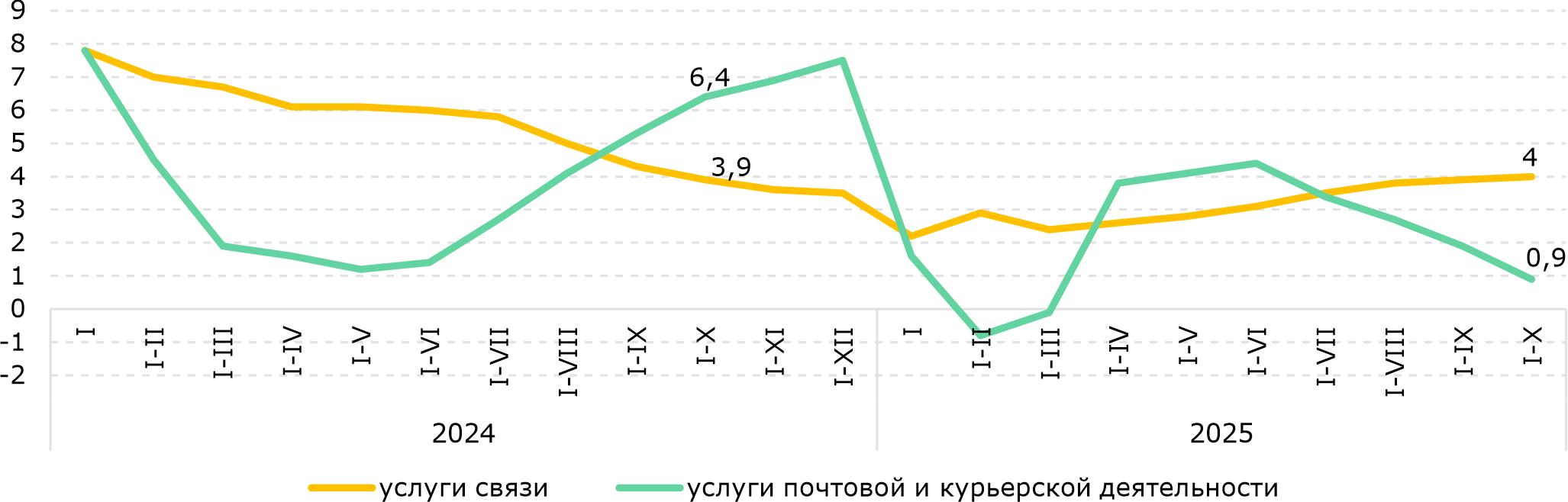 За 10 месяцев 2025 года рост услуг связи незначительно ускорился до 4% г/г, почтовой и курьерской службы – замедлился до 0,9% г/г по сравнению с результатами за 9 месяцев (+3,9% и +1,9% г/г соответственно), при этом рост почтово-курьерских услуг значительно ниже показателей аналогичного периода прошлого года (+6,4% г/г) (Рис. 1).