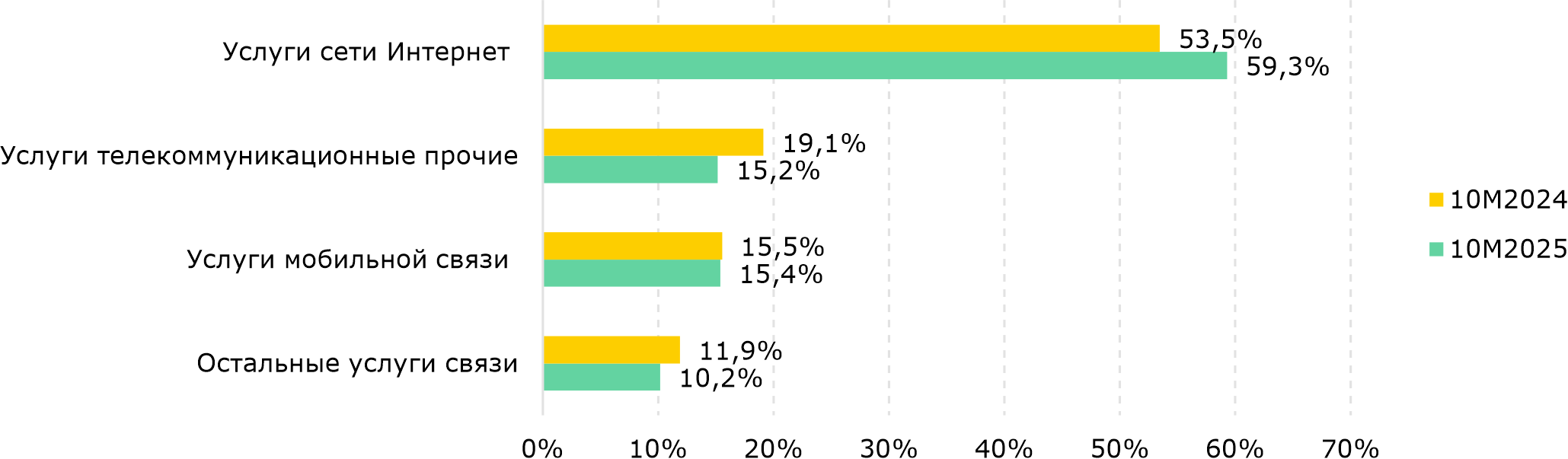 В январе–октябре 2025 года сектор связи продемонстрировал умеренный рост: объем услуг связи увеличился на 4% г/г, тогда как рост объемов почтовой и курьерской деятельности замедлился до 0,9% г/г. Структура рынка все более смещается в сторону интернет-услуг, доля которых увеличилась до 59,3% от общего объема услуг связи, при одновременном снижении вклада телефонной связи и прочих телекоммуникационных услуг. В отрасли также наблюдается постепенное замедление годового роста цен на услуги связи, а инвестиционная активность остается умеренной.