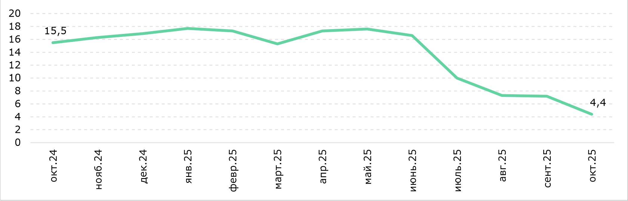Годовой рост цен на предоставляемые услуги связи замедлился с 7,2% г/г за 9М2025 до 4,4% г/г за 10М2025 (Рис. 3). Национальный банк в обзорах инфляционных тенденций отдельно отмечает замедление месячного роста цен на услуги связи и другие телекоммуникационные сервисы, что связано с ослаблением индексации и усилением ценовой конкуренции между операторами. Дополнительно на снижение роста цен услуг связи влияет запуск программ субсидирования отдельных видов услуг связи в рамках цифровизации сельскохозяйственных и промышленных объектов, позволяющих частично компенсировать затраты операторов.