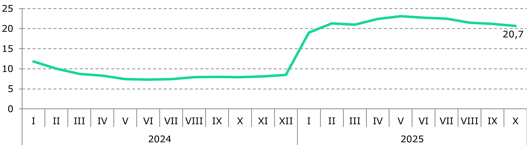 Транспортный сектор продолжает демонстрировать двузначные темпы роста на фоне высокой динамики ВВП: по итогам 10М2025 рост составил 20,7% г/г. При этом отмечается замедление темпов роста по сравнению с показателями, зафиксированными за последние пять месяцев текущего года (Рис. 1).