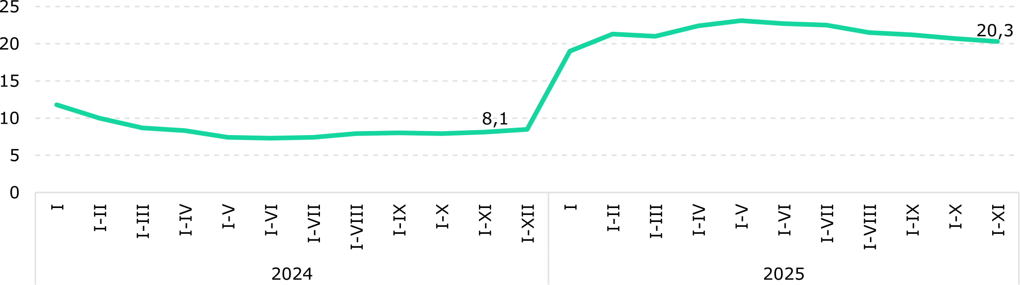 Грузовой автомобильный транспорт продолжает увеличивать свою долю в общем грузообороте (8,2% по итогам 11 месяцев 2025 года), демонстрируя наиболее высокую динамику +31,9% г/г. Такой значительный рост вызывает вопросы, поскольку общий объем транзитных перевозок через страну не увеличился пропорционально. Возможными факторами роста грузооборота в данном сегменте могли стать развитие электронной коммерции и систем доставок или изменение методологии учета грузооборота. В то же время грузооборот в воздушном и морском сегментах выросли на +6,5% и +15,6% соответственно, но их доля остается незначительной.