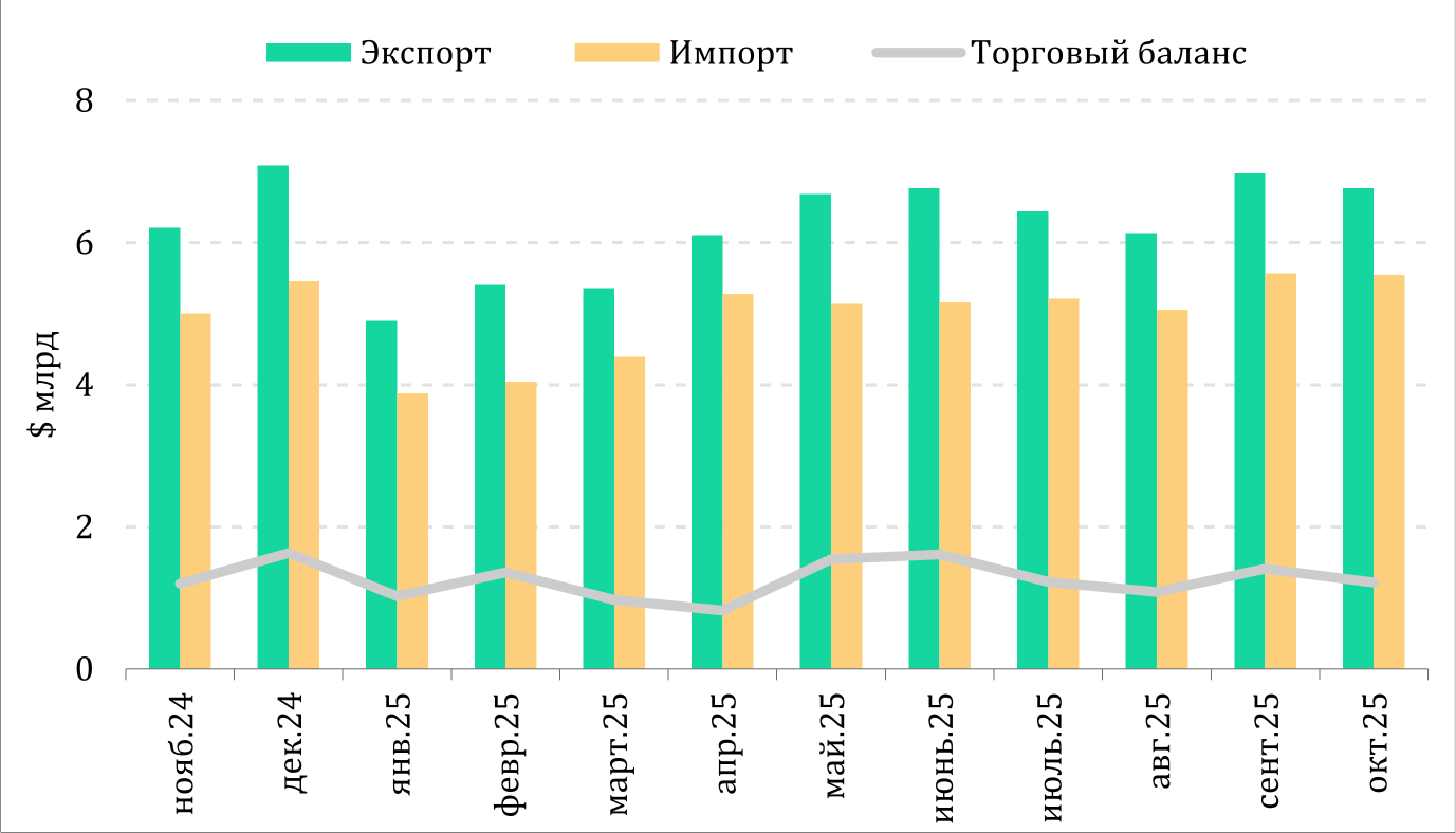 Объемы импорта в октябре также уменьшились, но только на 0,3% м/м до $5,8 млрд, но в годовом выражении продемонстрировали прирост на 5,9%. В целом за 10М2025 года общие объемы товарного импорта повысились на 4,7% г/г до $51,7 млрд ($49,4 млрд за 10М2024 года). Октябрьские показатели импорта, несмотря на небольшое уменьшение, сохранились близкими к исторически рекордному значению прошлого месяца.