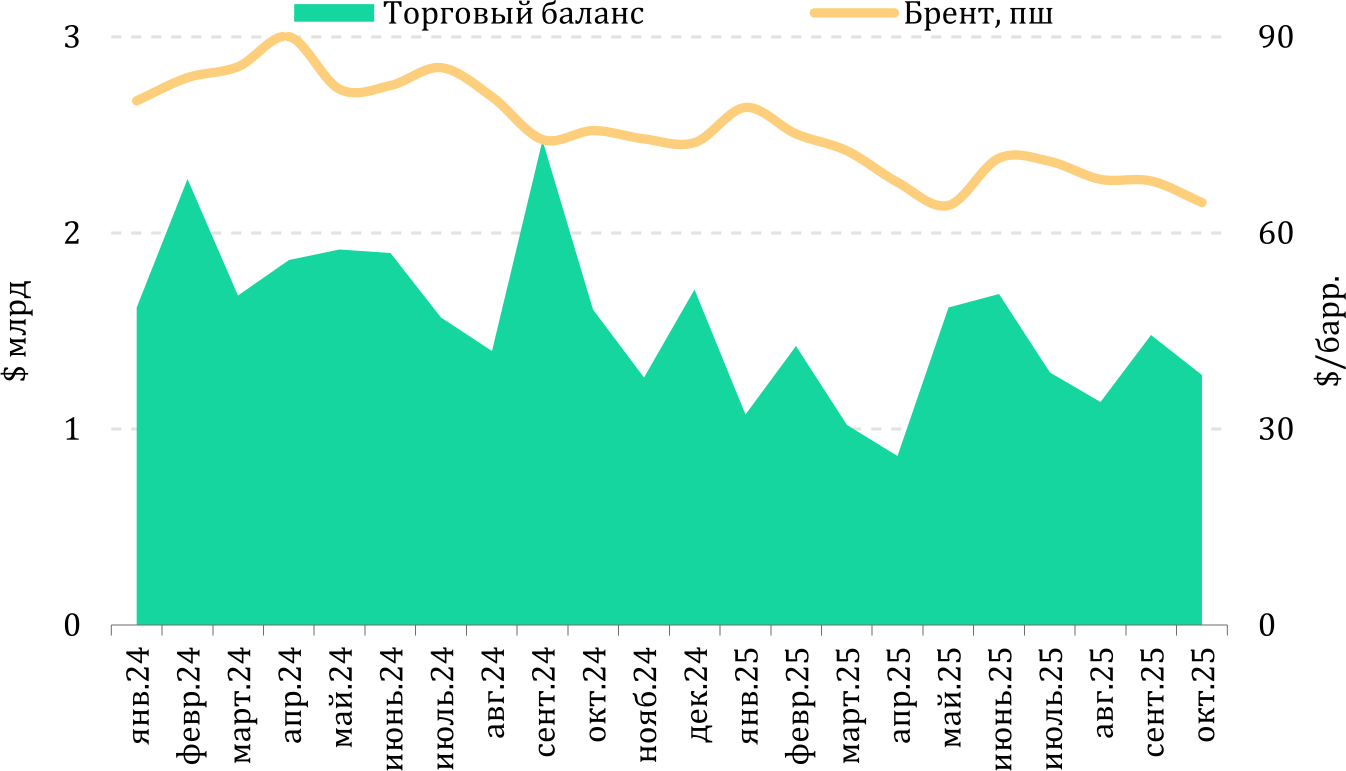 На фоне незначительного снижения импорта при более существенном спаде выручки от экспорта это сказалось на сокращении профицита торгового баланса в октябре до $1,3 млрд. В результате за 10М2025 года профицит внешней торговли сократился почти на 30% в годовом выражении с $18,3 млрд до $12,9 млрд.
