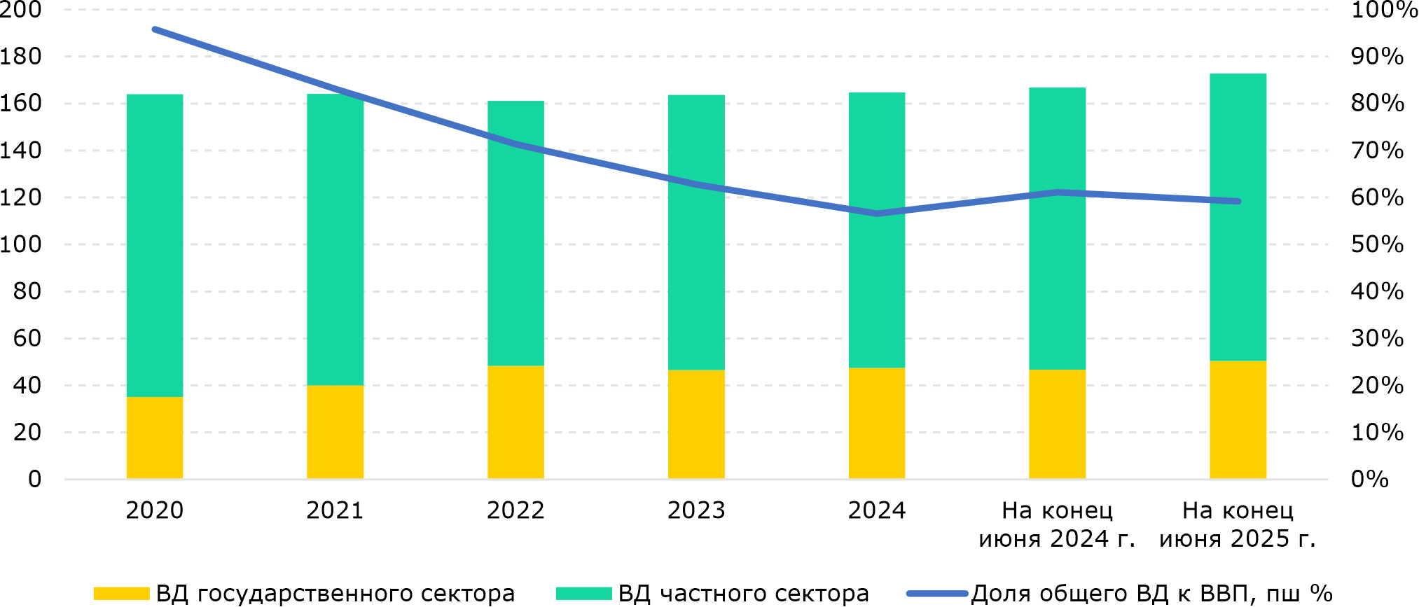 На конец июня 2025 года внешний долг (ВД) Казахстана составил $172,8 млрд, увеличившись на 3,6% г/г. За данный период отношение внешнего долга к ВВП составило 59,2%, увеличившись с 56,6% в 2024 году. Это связано с опережающим ростом внешнего долга по сравнению с динамикой ВВП. У стран с сопоставимой экономикой, таких как Россия и Узбекистан, в 2024 году отношение внешнего долга к ВВП составляло 13,4% и 55,7% соответственно, у развитых стран, таких как США – 124,3%.