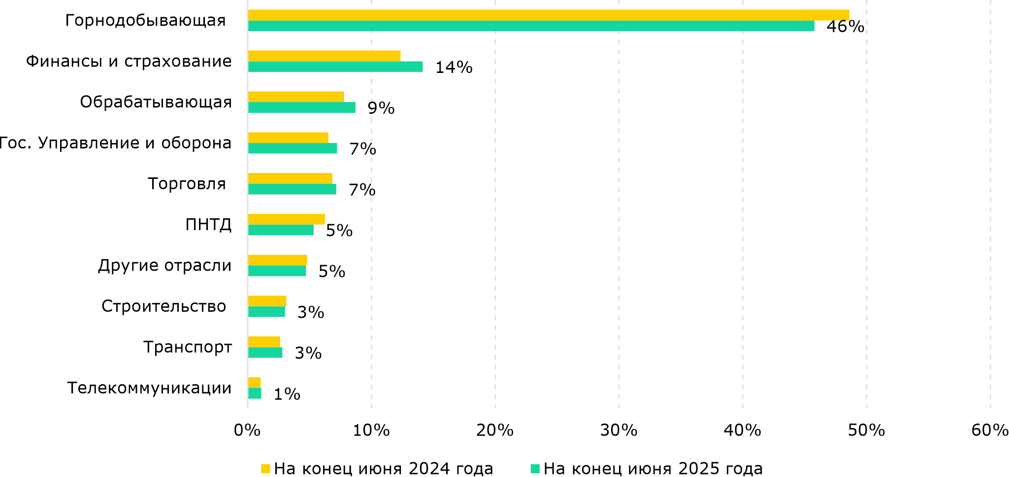 По отраслевой структуре внешнего долга наиболее преобладающей отраслью также является горнодобывающая промышленность (45,8% от ВД), в частности добыча нефти и газа, которая занимает около 42,5% от общего ВД (Рис. 2). Доля обрабатывающей промышленности составляла 8,7% на конец июня 2025 года. Внешний долг по оптовой и розничной торговле также показал небольшое увеличение до 7,2%. В целом отраслевая структура внешнего долга Казахстана показывает его сырьевую направленность.