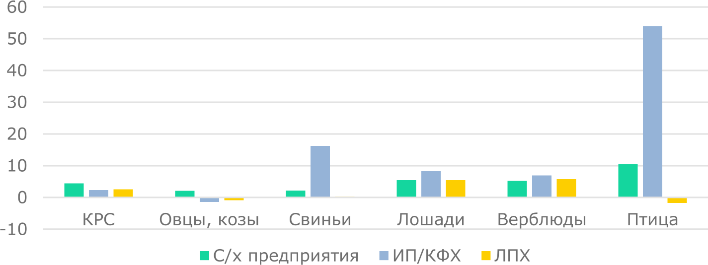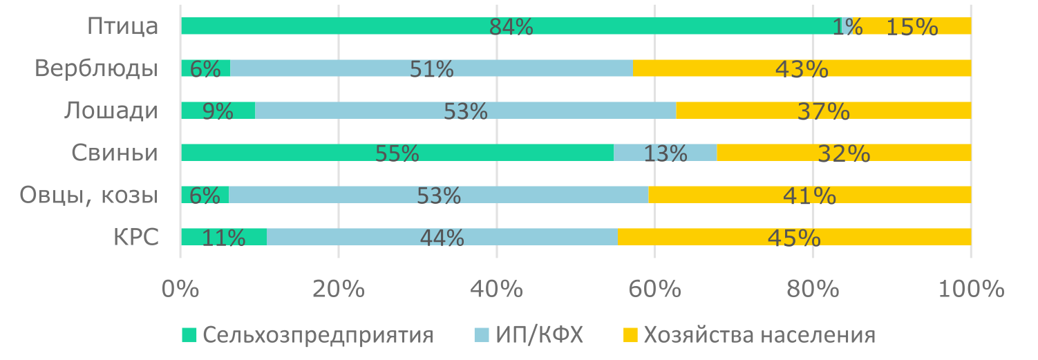 Структура по категориям хозяйств демонстрирует преобладание организованного сектора по большинству видов сельхозживотных (за исключением коз): 55% поголовья КРС приходится на сельхозформирования, тогда как оставшиеся 45% сосредоточены в хозяйствах населения. Доминирование сельхозформирований наблюдается по другим видам животных: 61% численности овец, 63% поголовья лошадей, 57,2% верблюдов относится к данной категории хозяйств. Птица также преимущественно сконцентрирована в сельхозформированиях (85% общего поголовья), что отражает индустриальный характер птицеводства.