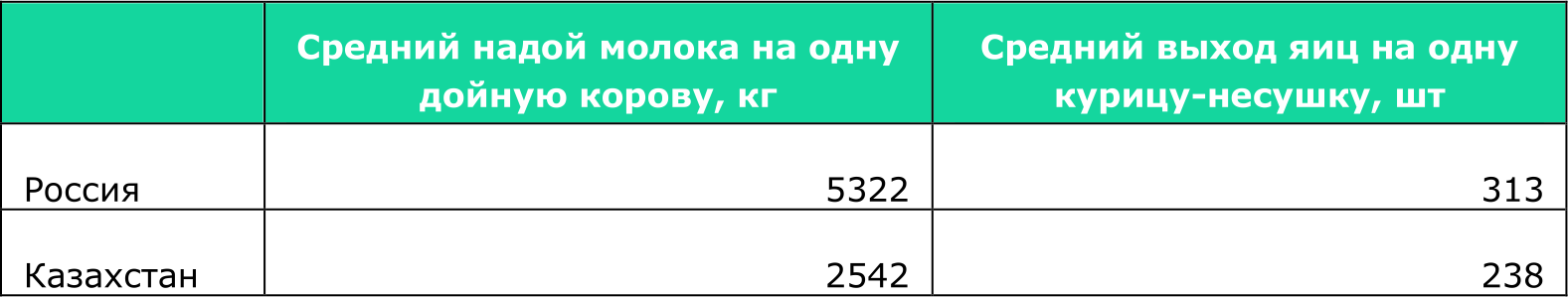 Таблица 1. Продуктивность основных видов продукции животноводства в РК и РФ за 2023 год